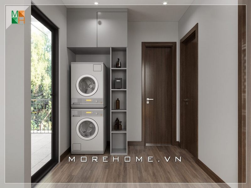 Thiết kế một phòng giặt hiện đại của nhà phố ngăn nắp, gọn gàng có tủ kệ đựng tiện lợi.