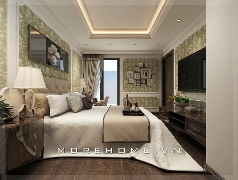 . Mẫu thiết kế phòng ngủ Master tại chung cư cao cấp đã được trang trí với những vật dụng decor đẹp mắt như giấy dán tường, giấy dán tường tân cổ điển, nội thất... tạo nên một bức tranh hoàn hảo và tiện nghi, để giúp bạn có một không gian sống ấn tượng.