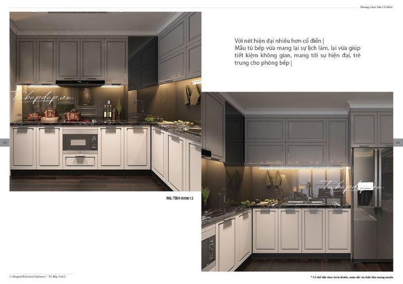 Mẫu tủ bếp được thiết kế theo phong cách tân cổ điển với những nét được cách tân hơi hướng thời đại hơn giúp tạo nên sự thoáng đãng và sang trọng.