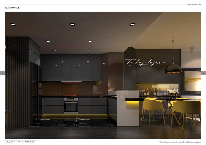 Để tạo nên phong cách hiện đại cho biệt thự, nhà phố, chung cư cao cấp, gợi ý thiết kế phòng bếp bao gồm tủ bếp acrylic xám bóng cùng bộ bàn ăn vàng, tạo nên sự kết hợp 2 tone cực hot trong những năm gần đây.