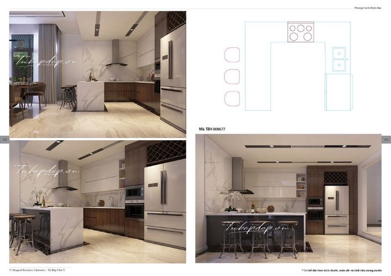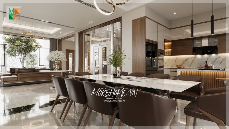 MoreHome chia sẻ đến bạn mẫu thiết kế phòng bếp dành cho biệt thự, nhà phố có phần đá ốp chân bàn đảo màu xanh xám sáng tạo
