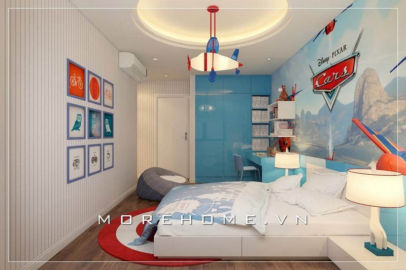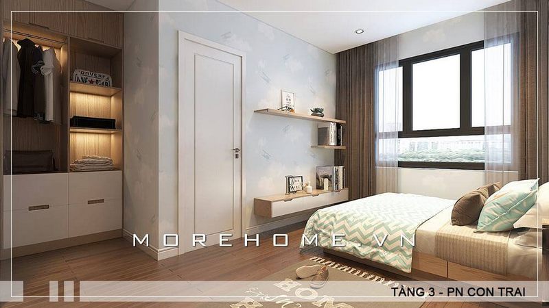 Mẫu thiết kế phòng ngủ hiện đại dành cho bé trai bao gồm một chiếc giường gỗ công nghiệp với ngăn kéo phía dưới để cung cấp cho bé một không gian lưu trữ riêng cho các đồ dùng cá nhân của mình.